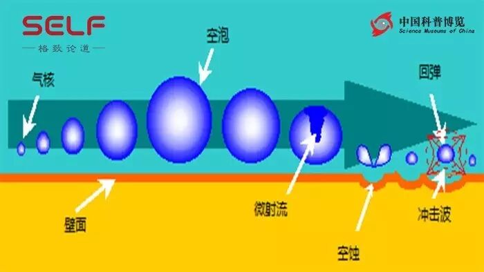 我们来看看空泡长什么样子:这是液体中的空泡;这个是壁面附近的空泡,大家看这些空泡像不像一个扫地机器人?这些空泡贴附在壁面上不断地游走,每秒钟几万次的冲击壁面,不知疲倦地对壁面进行清扫。