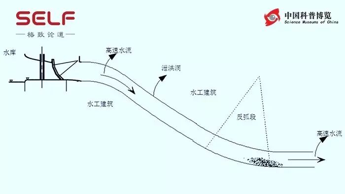 这些蚀坑为什么出现在这里呢?这个是一个示意图──在这个泄洪洞反弧段的末端,这个位置上它的流速发生了突然的变化,产生了一个低压区,小泡泡就在这里产生,而石坑恰恰也是出现在这里。