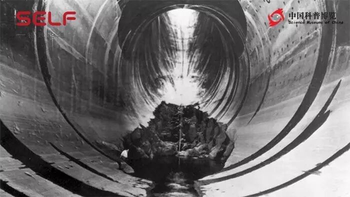 这是一座水坝,水坝要蓄水但是水坝也要泄洪,这是一个泄洪洞,大家看泄洪洞前面有一个巨大的一个蚀坑,我们把镜头拉远一点大家注意那个白点──那是一个人,所以这个洞是非常的大,这个蚀坑也非常的大,这个蚀坑就是这些小泡泡的一个杰作。