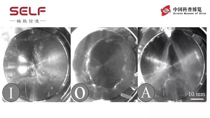 下面这张图里面显示的就是我们实验室拍摄的各种的空化结构,如果控制得当,我们可以让这些小泡泡干很多事情,我们可以让这些小泡泡可重复地沿着预设的线路输运颗粒物,大家看那些亮点实际上是一些玻璃碎屑,这些玻璃碎屑沿着预设的线路从一点移动到另一点,我们甚至还可以让它形成空化云的字母:这些小泡泡排布成一个字母IOA,Institute ofAcoustics就是中科院声学所的首字母的缩写。在屏幕上显示的就是空化云,这些空化云就是由数不清的泡泡组成的。