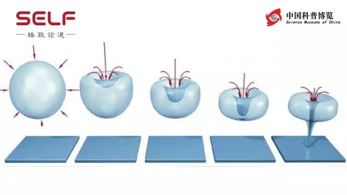 如果一个泡炮在壁面的附近,由于动量的不平衡,在这个泡泡的顶部就会产生变形凹陷,同时形成一个穿透液体内部的一个高速射流打在壁面上。这个泡泡变小的过程实际上是非常快的,我们称之为“溃灭”,英文叫做collapse,每一次collapse就相当于是小爆炸一样。