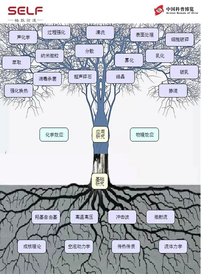这是我绘制的一张空化树:它的根部表示基础研究;它的枝叶的部分表示的是应用研究,这些泡泡虽然很小,但是它真的不简单──它是以流体力学、空泡动力学、传热传质、成核理论为基础的,在各行各业形成了非常广泛的应用。比如说超声清洗、声化学、过程强化、掺混、破乳、乳化……等等。