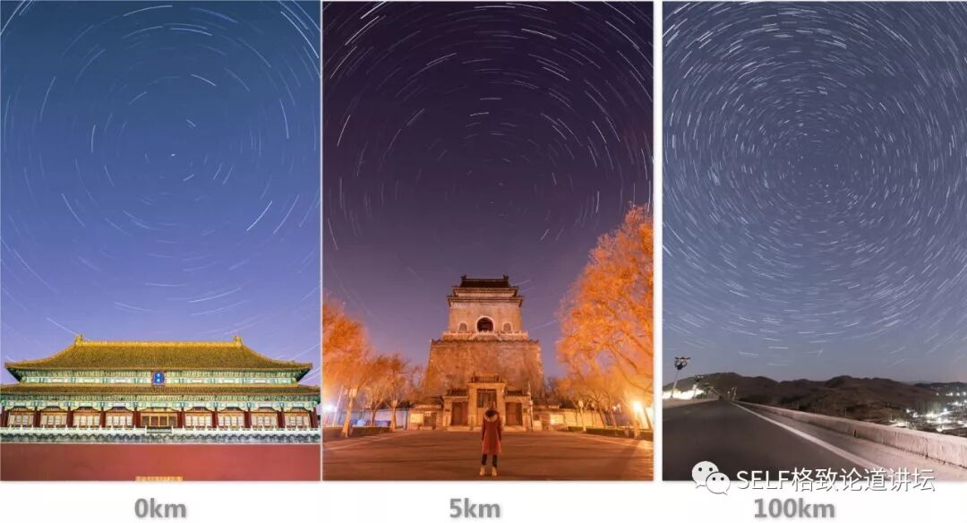 这三张图分别是在故宫的午门、距离故宫5公里的钟鼓楼文化广场以及距离故宫100公里的密云水库拍摄的星轨作品。星轨是长时间曝光的图片中,由恒星产生的持续移动轨道。
