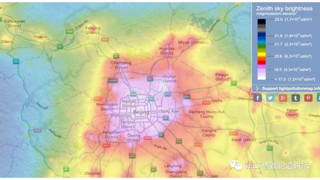 这是北京的光污染地图。图中,城区的大部分被一片白色的光所笼罩。不仅是北京,我们地球上的不少地方都深受光污染的影响。
