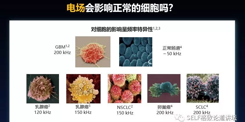 比如说小肠上皮细胞是可以增殖的,抑制它需要50kHz的频率,而我们想抑制脑肿瘤细胞需要200kHz的频率。因为频率不同,所以对正常细胞没有副作用。