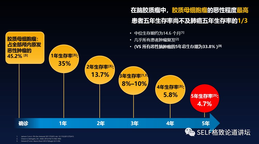 不同的统计可能在幅度上略有浮动,但是总的来说疗效不足肺癌的三分之一。所以我们说脑胶质母细胞瘤是人类难治性的肿瘤,虽然发生在小的器官——大脑只占全身体重的3%~4%,但一旦得上,是严重威胁人类生命的一种疾病。