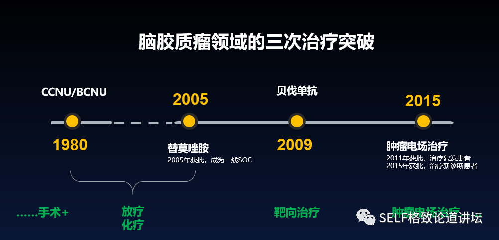 2015年又有一个新的疗法出现了,就是肿瘤电场治疗。在既往手术、放、化疗(替莫唑胺)治疗的基础上,又客观地延长了病人的总生存期,后面我会介绍这种新的脑肿瘤诊治方法。