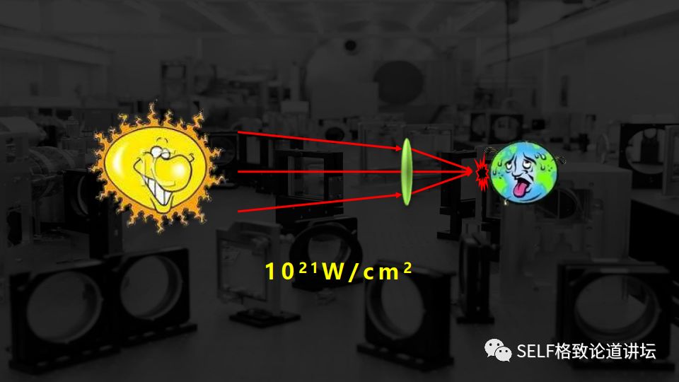 从名字上就可以看出来,超强超短激光有两大特点:第一大特点是超强,激光的强度特别高,光强可以达到1021W/cm2。