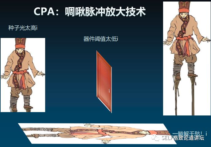 好比人通过一扇门时会碰到头,这个问题怎么解决呢?科学家找出了一种方法——“一躺解千愁”,让人躺着过去、爬着过去,爬的过程中给他一副高跷,过了门以后再让他立起来。激光在放大之后就远远高于种子光的光强了。