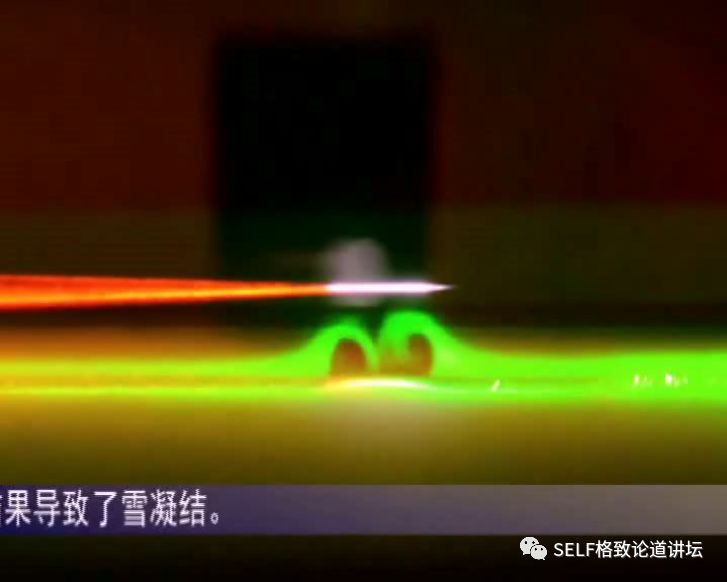 我们也可以进行激光诱导降雪,当激光进入气室的时候会形成相反转动的涡旋,这里的水汽高速地碰撞,导致了雪凝的现象。激光开射半小时甚至一个小时以后,在靶壁上可以看到有大量的雪花存在。