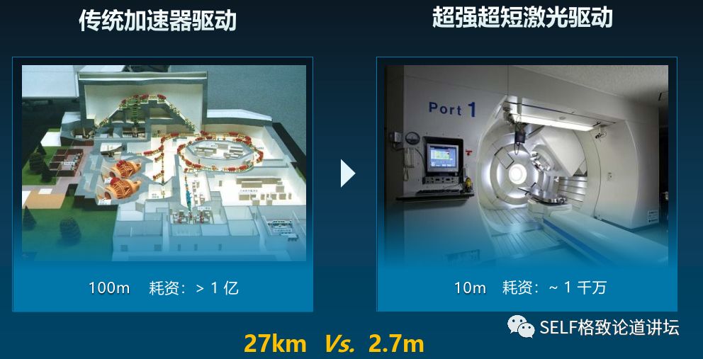 目前世界上最发达的加速器是在欧洲,横跨三个国家,周长是27千米。按照1万倍的加速梯度,用超强超短激光2.7米就可以获得类似的结果。