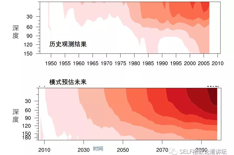 我马上就想到,在二氧化碳增加所引起的辐射中,海水表层的温度增加得比较快,下层增加得比较慢。大家看,这两张图分别是历史观测的结果和模式预估的结果。