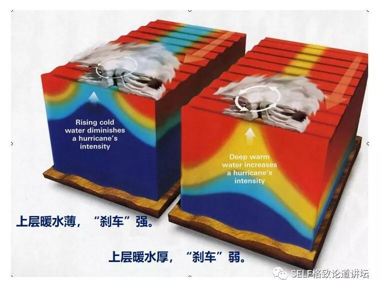 不过,这个刹车的作用有强有弱。当上层温暖海水比较薄的时候,台风卷起来的冷水比较冷,刹车作用就比较强;当上层温暖海水比较厚的时候,台风卷起来的冷水没那么冷,刹车作用就比较弱。