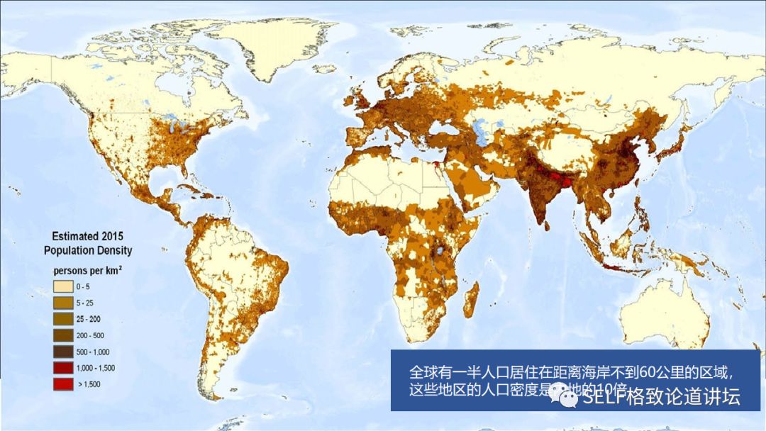 或许有朋友会说,对于北方而言,温度升高一点有什么影响呢?没准农作物会长得更好呢。事实果真如此吗?通过这张图,我们可以很清晰地看到,目前全球有一半的人口都居住在沿海60千米以内的范围,人口如此分布主要是由现代工业文明的整体发展状况决定的。