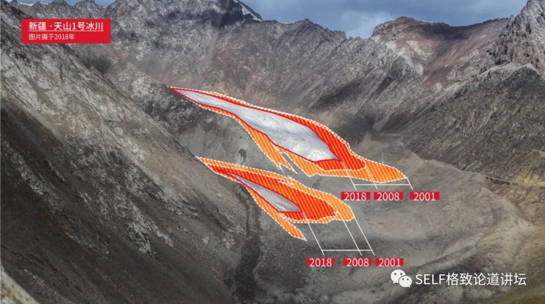 大家看这张图,2018年天山冰川面积和2008年、2001年相比,都有了很明显的萎缩。这些都是全球逐渐暖化的表现。
