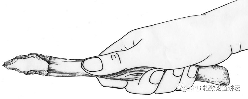 大家看,这是最后的一击。最终的产品就是这样的,非常锋利,非常规范。那么他打下这个石片用来做什么呢?其实,这个石片本身就是一个工具,它会被镶嵌到木头上、鹿角上,或者壶柄上来使用。