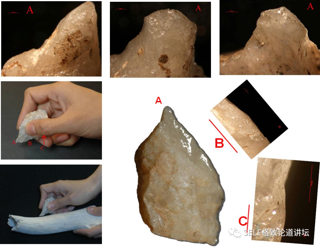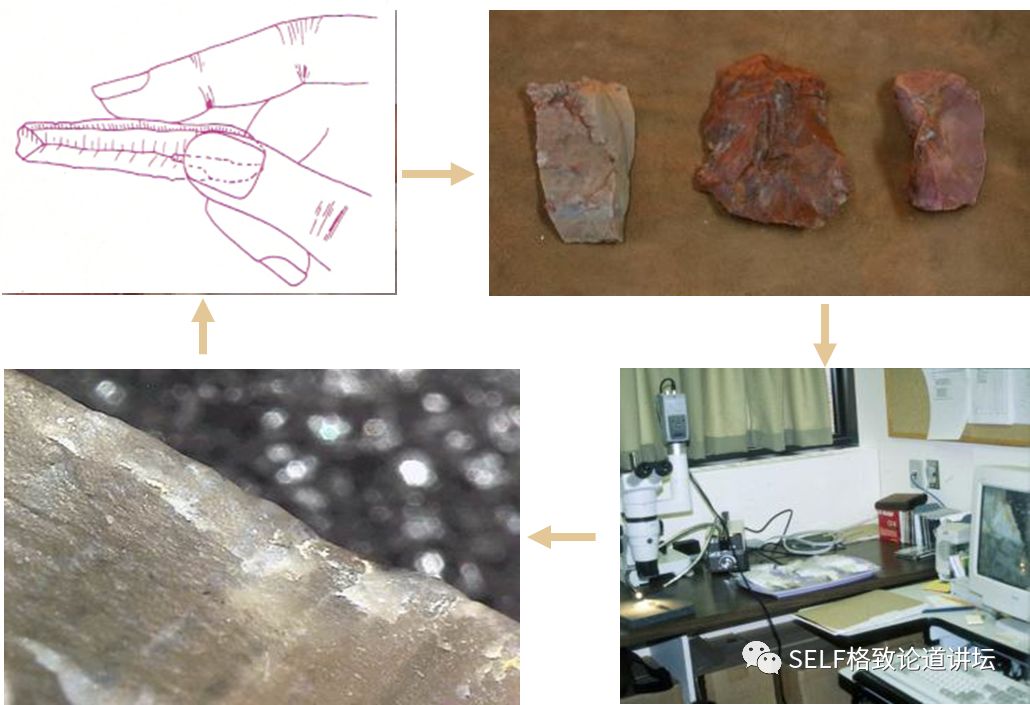 我们把实验的标本和考古遗址发现的标本进行比较,看看哪种痕迹最相似,我们就能知道这件石器当年是怎么被使用的了。