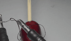 当然,我们也做了一些非常有意思的视频。这是葡萄皮缝合的实验,它的操作非常精细,葡萄皮非常薄,果肉非常软,我们缝合之后,葡萄还是完好无损的。