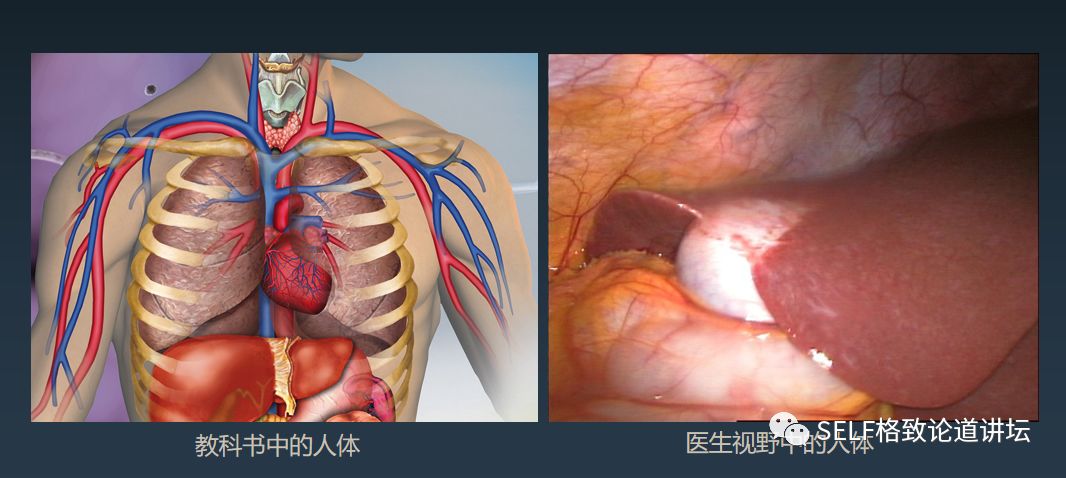 左边是教科书上能够看到的,人的组织器官分得非常鲜明,血液都是有颜色的。