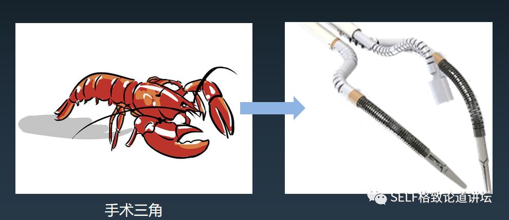 小龙虾的形态非常好,因为小龙虾的眼睛和两只手正好构成了手术中一个非常专业的术语叫手术三角,人做手术的时候也是两只手张开,眼睛看着,这样的一个三角关系才能把手术做好。