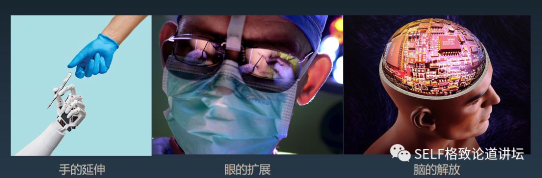 这就是我想传达的三个方面,机器人是人手的延伸、眼的扩展和脑的解放。