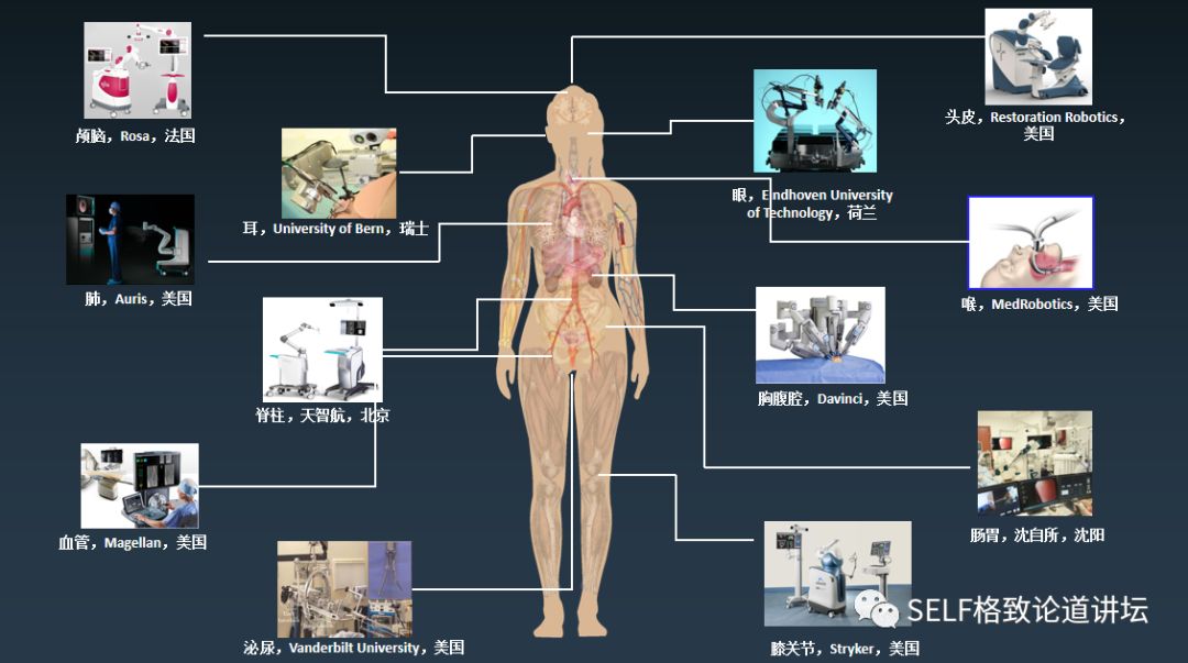 但实际上发展到现在,手术机器人受到不同手术的部位以及操作等各种因素的影响,它的种类千奇百怪、五花八门。到目前为止,从头发丝到脚趾头有各种各样的手术机器人在临床使用或者在研究中。