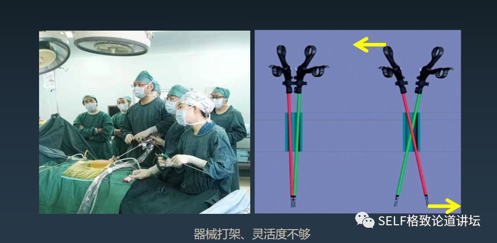 这是一个做单孔手术的场景,想象一下,当我们把很多器械、内窥镜都从一个孔道放到腹腔里的时候,这些器械的操作必然会打架。
