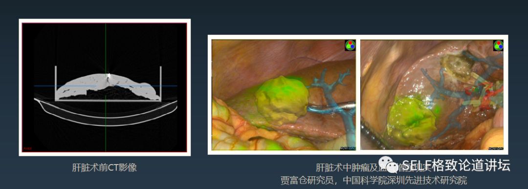 当然还有另外一种技术,就是增强现实技术。我们在术前可以通过CT、超声诊断出一些病变,把它三维呈现出来,并且在三维图像上能够找到这些病变组织,包括一些血管,然后再叠加到我们的手术过程中。