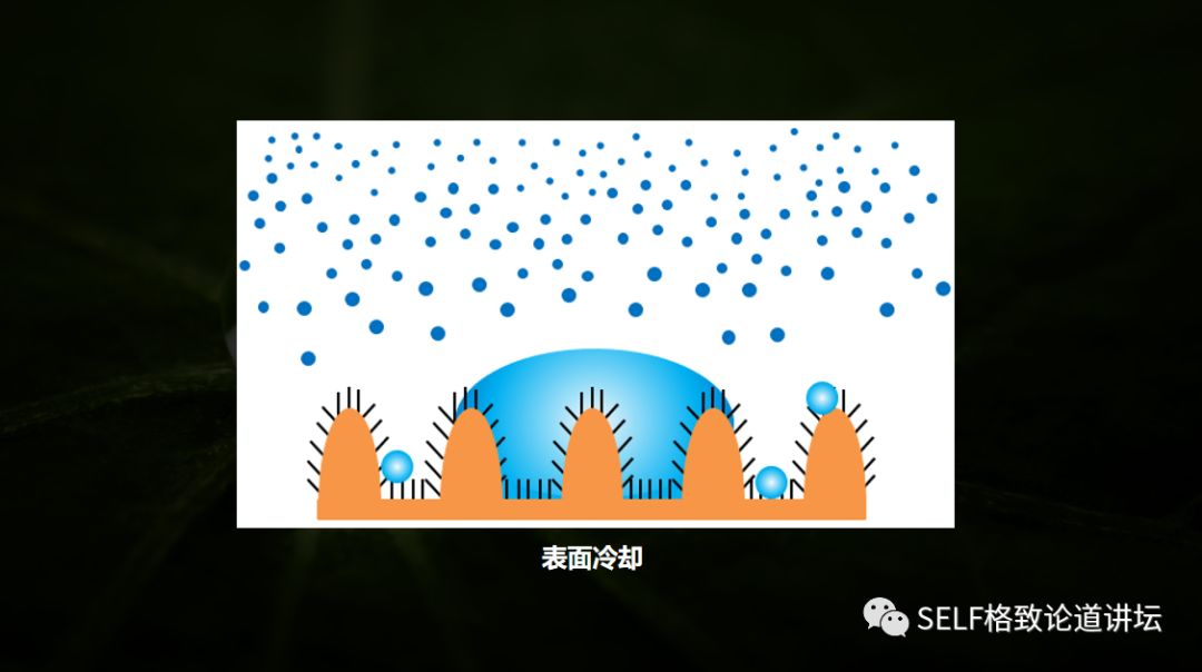 为什么荷叶对雨水是超疏水的,而在低温潮湿环境下会被冷凝液穿透,原因在于:周边的水分子尺寸非常小,远远小于荷叶微米乳突以及纳米突起之间的缝隙,水分子会优先在微纳结构缝隙内部凝结,之后不断地吸收水汽长大,冷凝液会牢牢地黏附,很难去除。