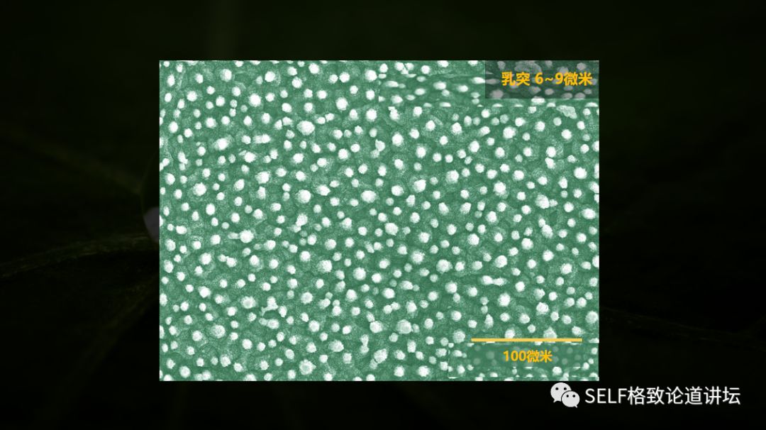 在高倍电子显微镜下,我们可以发现荷叶表面分布有无数的微米乳突,每个乳突的大小大概6~9um,间距是20um。