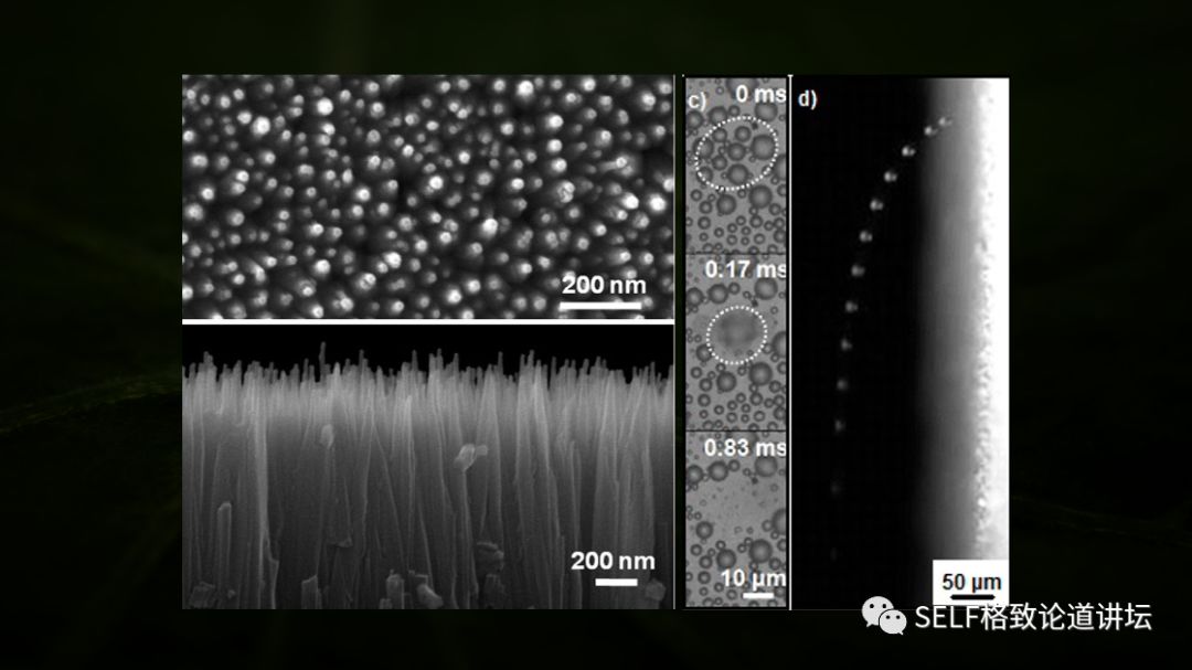 受此启发,我们提出了“材料表面原位生长密排列纳米针锥就可以实现小尺度冷凝微液滴融合自弹射去除”的策略。左侧这张是光学正视图,可以看到,冷凝液滴通过相互融合自动从表面消失。右侧是光学侧视图,我们可以清晰地看到冷凝液滴在表面自弹射去除的轨迹。
