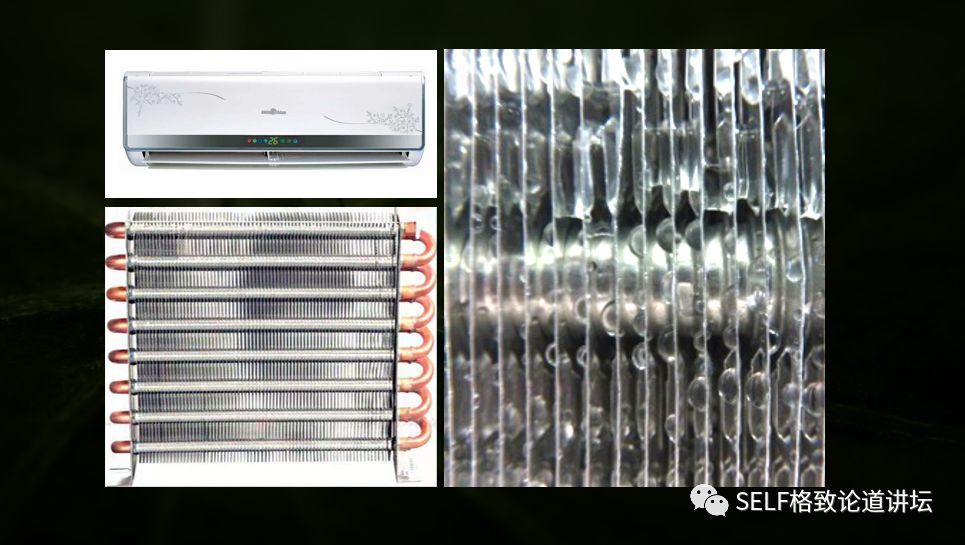 通过这个视频,能够更直观地感受到:冷凝液滴在纳米仿生表面能够自弹射去除、很难长时间驻留。这种新型的、冷凝微滴可自弹射去除的纳米仿生技术,正好能够解决空调散热器翅片通道易被冷凝液阻塞的技术难题。