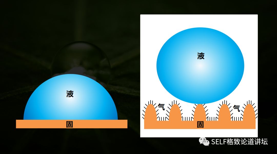 光滑平整表面通常是固液两相接触,液滴黏附在表面很难去除,而荷叶表面的微纳结构可以实现固-液-气三相接触,液滴会悬浮在微纳结构表面,水珠与固体表面的接触面积也会大大减小。也就是说,固-液界面黏附会大大降低,水滴在表面很容易滚离,并且沿途带走灰尘。