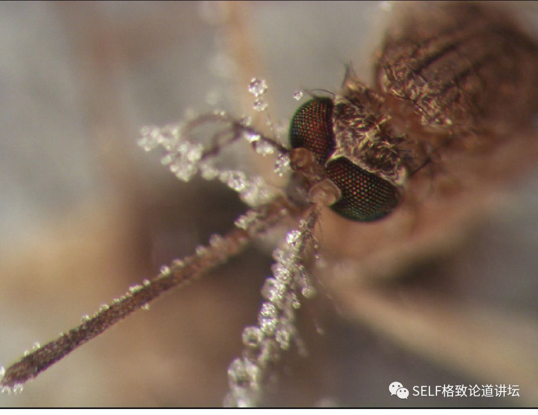 于是我们做了一个实验,将捕捉的蚊子黏附在双面胶表面,一边喷雾一边在高分辨光学显微镜下观测:我们发现水汽会在蚊子的口器以及触角表面凝结成球状的微滴,但是在蚊眼表面却不会。换言之,蚊眼表面可以防雾。