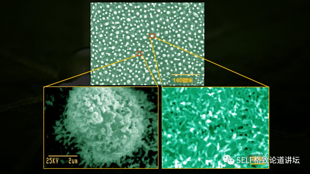 更有意思的是,如果进一步放大,我们还会发现:每个微米乳突以及乳突和乳突缝隙的表面还包覆有更精细的纳米突起。荷叶表面其实是一种精细的微纳复合结构,而不是我们肉眼所看到的光滑平整表面。