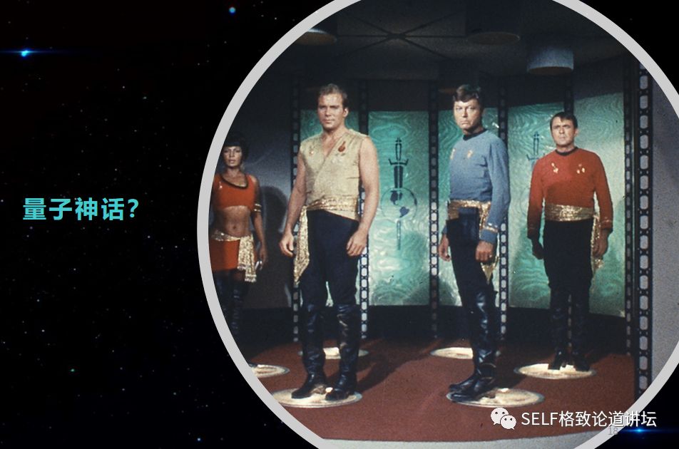 量子力学能让人大开脑洞,赋予你不明绝厉的力量,就能把这个漏洞填平。这是一个很古老的美剧《星际迷航》的海报,这里面就有一个梗,把人放在超时空传送器里,一摁按钮,这个人从这个地方突然消失了,而在另外一个地点,瞬间就冒出来了,类似于穿越的概念。