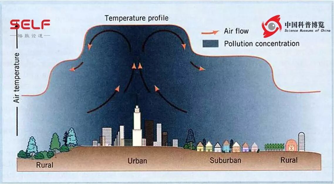 城市热岛与污染物上升图
