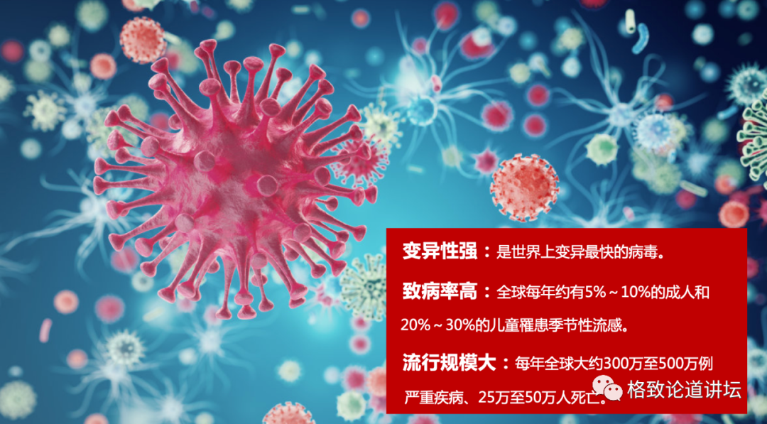 “流感病毒本身长得很漂亮,变异性非常强,它是世界上最容易突变、突变最快的病毒之一。因为突变,所以防不胜防,导致它致死率、致病率非常高,全球将近每年有25-30万的人因流感病毒而死亡。”