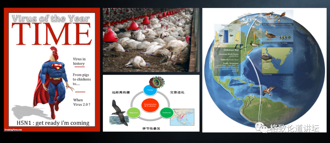 来看一下1997年的禽流感暴发。当时禽流感已经上了美国TIME杂志最主要的封面,封面上是一个挂着鸡头的Superman。它给我们的警示是病毒造成了畜禽养殖场(鸡群)的大面积死伤。
