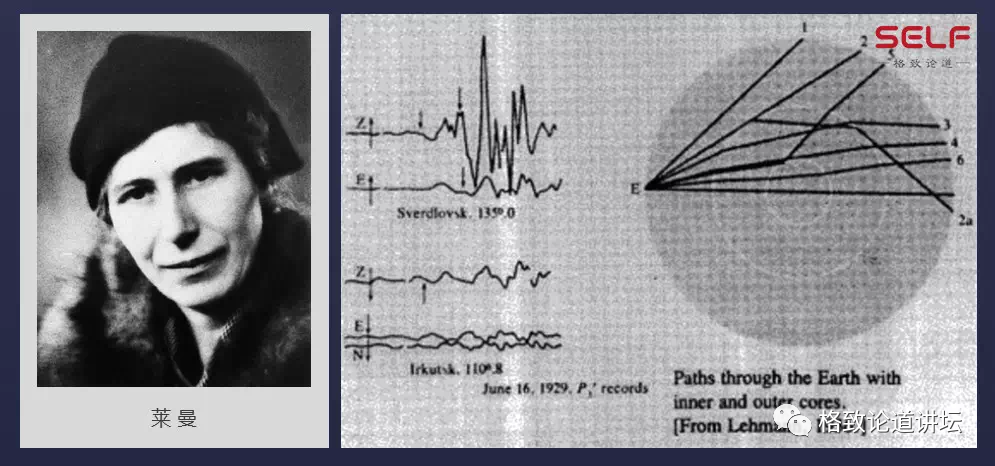 第一个就是她的论文题目是最短的,只有一个字母“P”再加一个撇,什么意思呢?就是穿透内核的地震波的缩写形式。另外,莱曼也是我所认知的寿命最长的学者,1888年出生,是金牛座人士,1993年去世,活了105岁,差一点见证了两个世纪的历史。