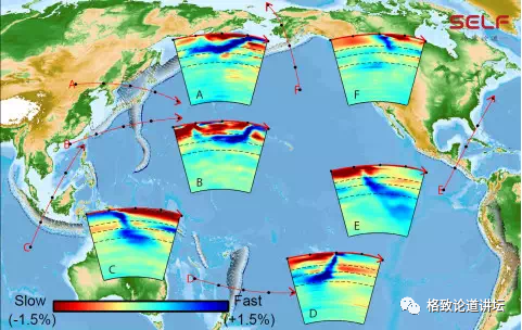 这是换了一个视角,我们看它的剖面图,这些蓝色就是地球表面俯冲的板片进入到了地球的深部。不同的深部,就表现出来的不同的颜色,有的平躺,有的散落在下地慢当中去了,如果没有地震波,我们能看到这样的地球内部吗?