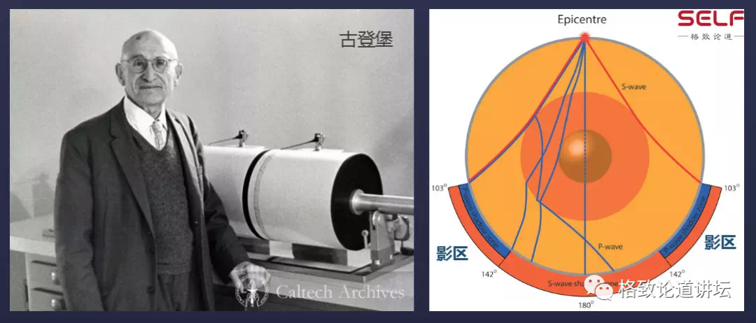 古登堡老先生从地震图上看到了一些端倪,他追踪S波和P波,发现到大震中去的时候,S波突然间神奇地消失了,而P波也突然间刹车减速了。为什么呢?