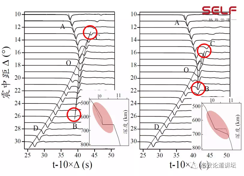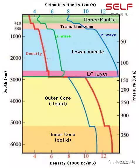 这张图已经看到了,跟我们刚刚说的简单的层状图形来比,还是要复杂得多,特别是在410和660那两个地方,可以发现速度也发生了急剧的变化,这个区域叫作“地幔转换带”,这就是我比较感兴趣的区域。