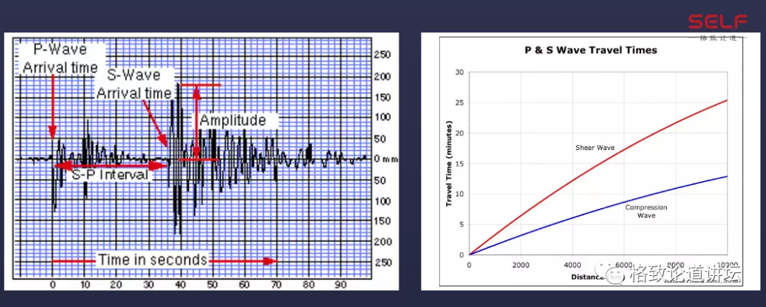 在这里教大家一个窍门,如果我们把不同台站的波形记录到的时间,点在这张图上,会发现连成一根曲线。这个曲线的斜率是很重要的,斜率就能告诉你地球内部的速度结构。