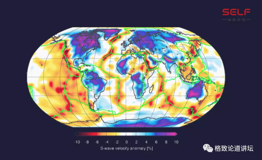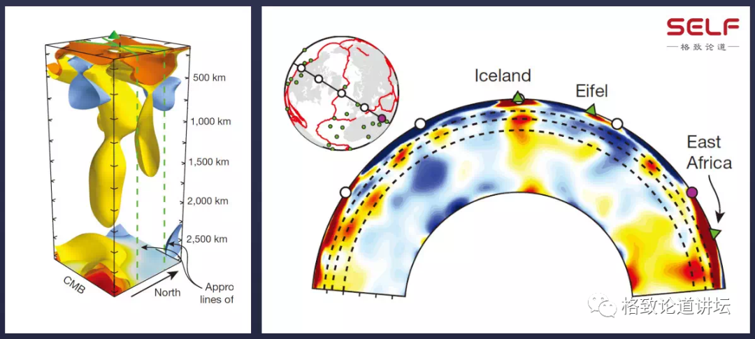 这张图以暖色调为基础的,上面的小三角是冰岛,冰岛是火山区,大家可以看到滋养冰岛的物质,热物质的上涌,原来不是那么浅的,可以来自于核幔的边界。