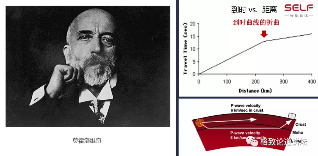 1909年,莫霍洛维奇把有限的数据点在一张图上,他发现了什么?这根曲线存在一个拐点,意味着什么?地球某一个深度速度发生了变化。
