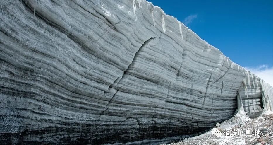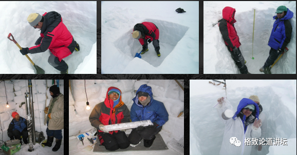 图中我们可以看到去年的雪和今年的雪,一层一层,像树木年轮一样,我要研究的就是冰川的历史记录。