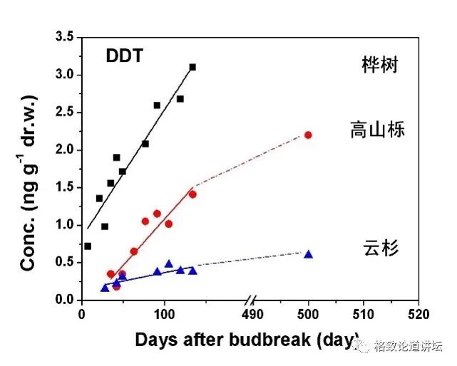 我们发现:主要的树种在整个生长季,甚至整个生长期,也就是停止生长之后还没有掉落的时期中,都在吸收大气中的DDT。