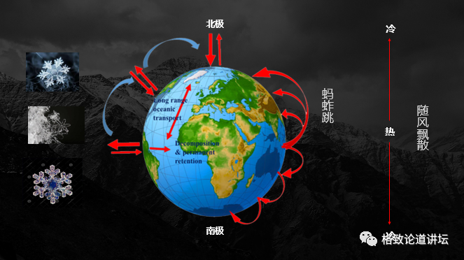 我们可以把这个传输和迁移的方式想象成一只蚂蚱,从热的地方向冷的地方“跳”,这样的现象被称为有机污染物的蚂蚱跳效应。