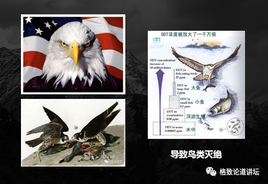 DDT是历史上使用时间最长、用途最广的一种农药。但20世纪70年代,科学家发现美国的国鸟白头海雕濒临灭绝,主要是因为DDT的使用使得白头海雕的蛋壳变薄,它在孵化过程中由于没有蛋壳的保护,幼鸟就孵化不出来,这样就慢慢导致了白头海雕的灭绝。